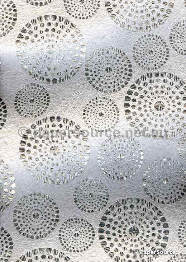 A geometric pattern foiled in gleaming silver metallic on a richly dyed crushed quartz (white pearl), pearlescent finish paper which has been manufactured from 100% handmade, recycled cotton and silk.