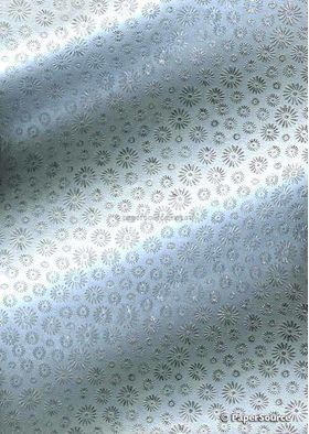 A classic pattern foiled in gleaming silver metallic on a richly dyed ice baby blue pearlescent, metallic finish paper which has been manufactured from 100% handmade, recycled cotton and silk.