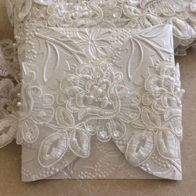 Hand beaded with clear and iridescent sequins or pearls and feature delicate scalloped edges, these lace borders are perfect for Wedding invites, Guest books, Unity candles, flower girl baskets, Chair trims, Bomboniere and much more!