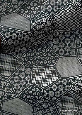 A geometric pattern foiled in gleaming silver metallic on a richly dyed black, matte finish paper which has been manufactured from 100% handmade, recycled cotton and silk.