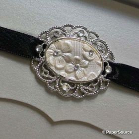 Image 2 and 3: Our sample invitations feature our C6 Rigid Box lined with White Exotic Silk and our C6 Pocketwrap. A Silver Cameo frame has been inset with our Bouquet Champagne Embossed paper and embellished with Adhesive Diamantes.