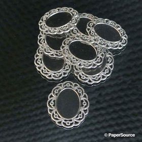 This striking silver frame can be a beautiful addition to your invitation, Mothers' Day card or crafty project. The metal surround has a smooth back and are easily attached to paper, plastic, glass, fabric …practically anything. We suggest using hot melt glue for good adhesion. Popular for use on cards, but can be used on lace or velvet chokers, brooches, made into rings, unity or special memorial candles and much more! Add an oval of decorative paper, a small bow or band of ribbon and place under the cameo. Adhesive diamantes or pearls added to the filigree metalwork provide a wow effect.